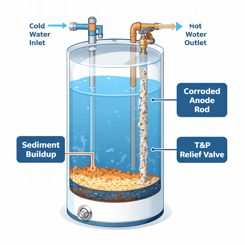 - 39 tanks had severely corroded or completely missing anode rods. An anode rod is a sacrificial metal rod inside every tank designed to corrode instead of the tank walls. Once it’s gone, the tank itself starts rusting from the inside out. A $35 anode rod replacement every 4 years can double a heater’s life. Almost nobody in Houston does it.